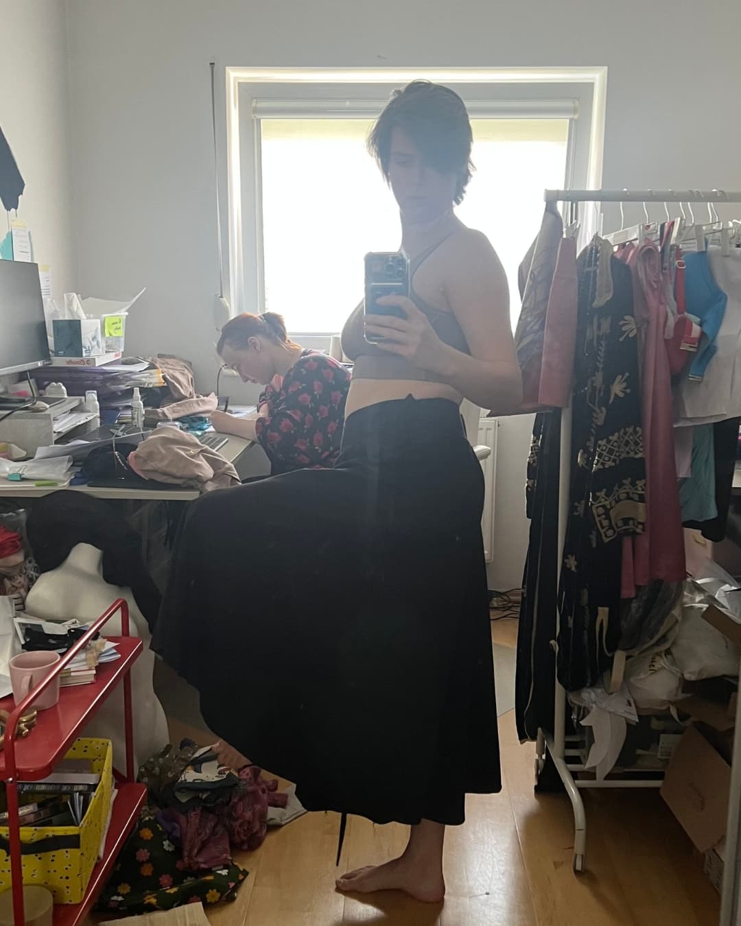 Współpracujemy z konstruktorką, a pierwsze prototypy szyliśmy z materiałów, które mamy po zaprzyjaźnionej polskiej marce — bo nie ma powodu tworzyć od razu nowych rolek materiału, jeśli możemy zacząć odpowiedzialnie.