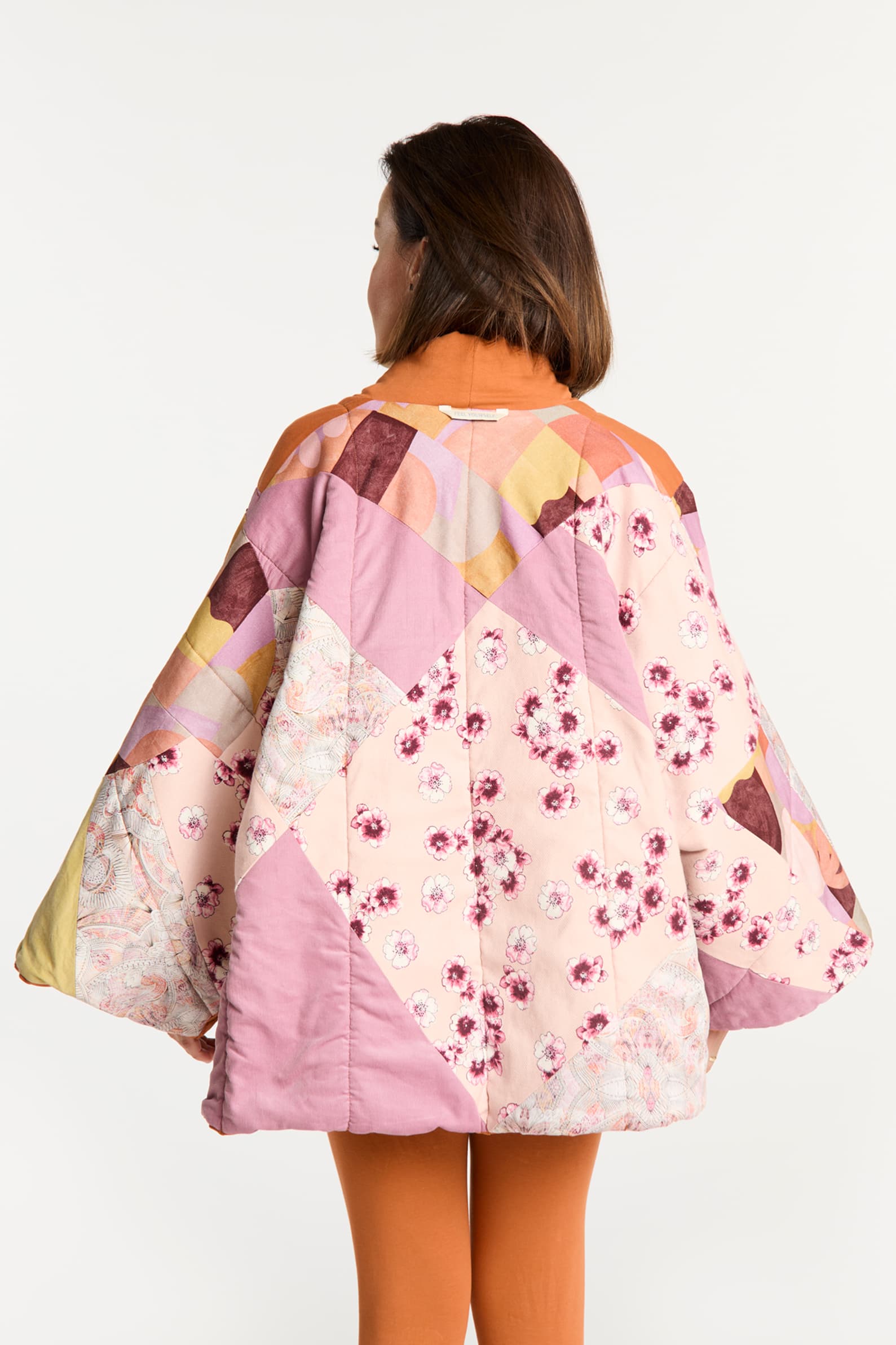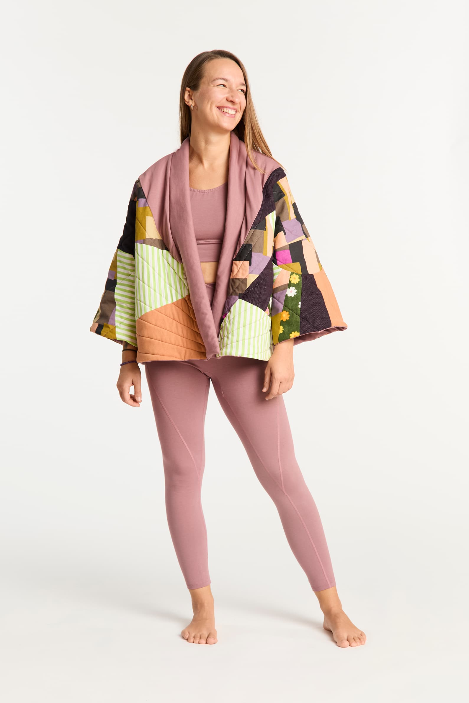 Dwustronne kimono o luźnym, otulającym kroju, pikowane, wypełnione czystą wełną, uszyte z bawełny organicznej typu French Terry z certyfikatem GOTS, patchwork w duchu upcyclingu, baza w kolorze zgaszonej leśnej zieleni, wykonane lokalnie w Polsce.